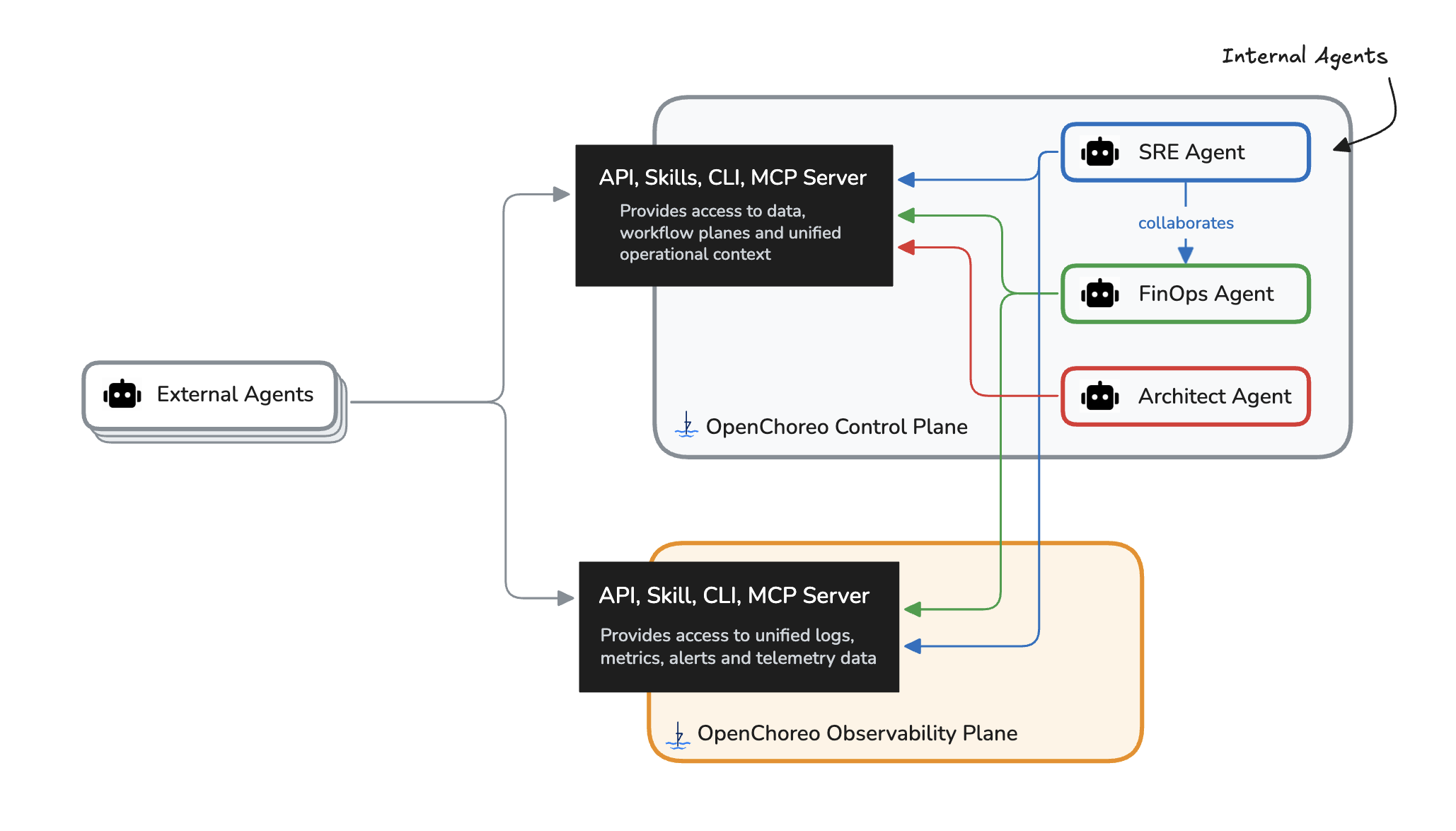 On the other hand, OpenChoreo ships its own built-in agents to help your teams day to day. The SRE agents analyze logs, metrics, and traces to surface likely root causes of issues using LLMs (root cause analysis). The upcoming FinOps agent helps teams understand and optimize their resource costs. The Architect agent assists with system design decisions.