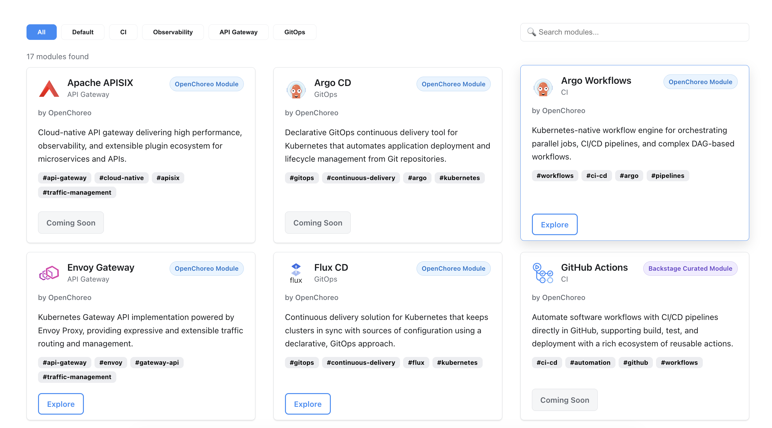 OpenChoreo is built around the idea that you should build a platform that fits your organization, rather than inherit a fixed stack. Just as Backstage has plugins, OpenChoreo has modules that plug into the platform's planes. Today, this includes API gateway options such as Kong, Envoy, Kgateway, and Traefik.