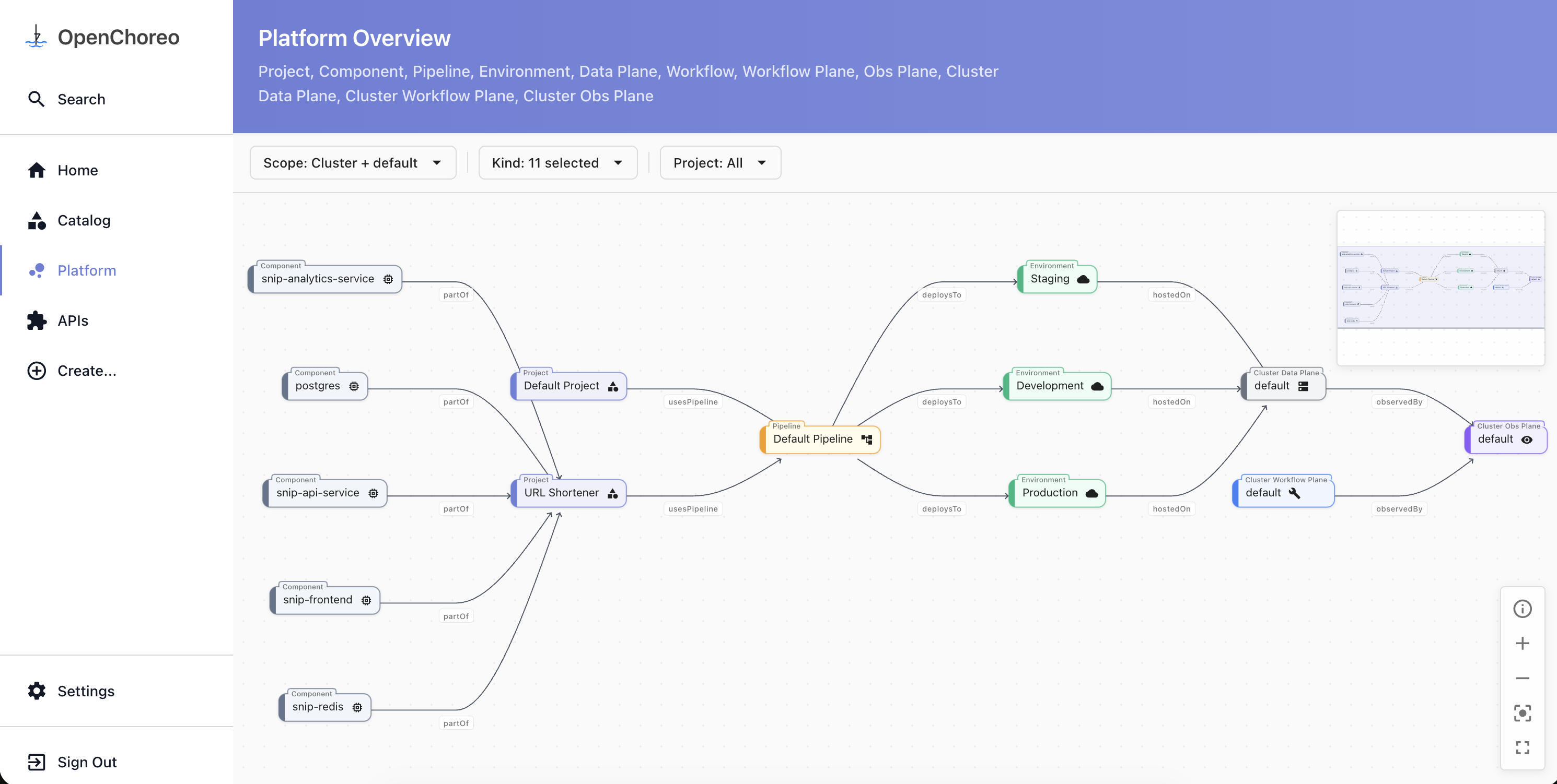 Developers and platform engineers get a unified view of how every component, pipeline, and environment connect across planes, making it easy to reason about the platform as a whole rather than just individual pieces.