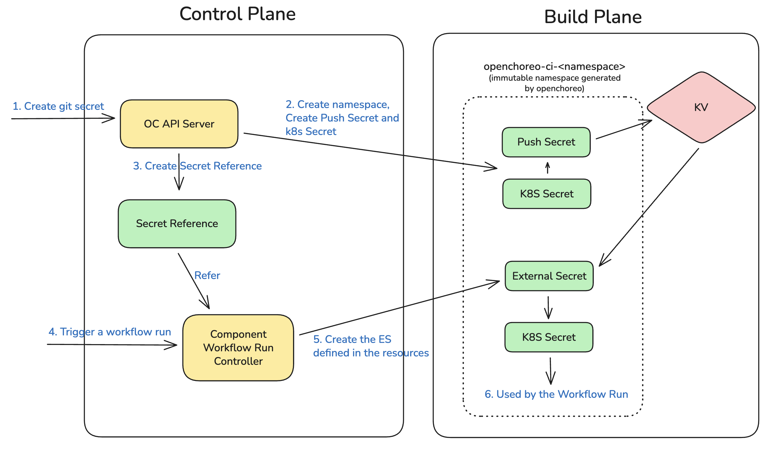 - Control Plane: ComponentWorkflowRun references the SecretReference