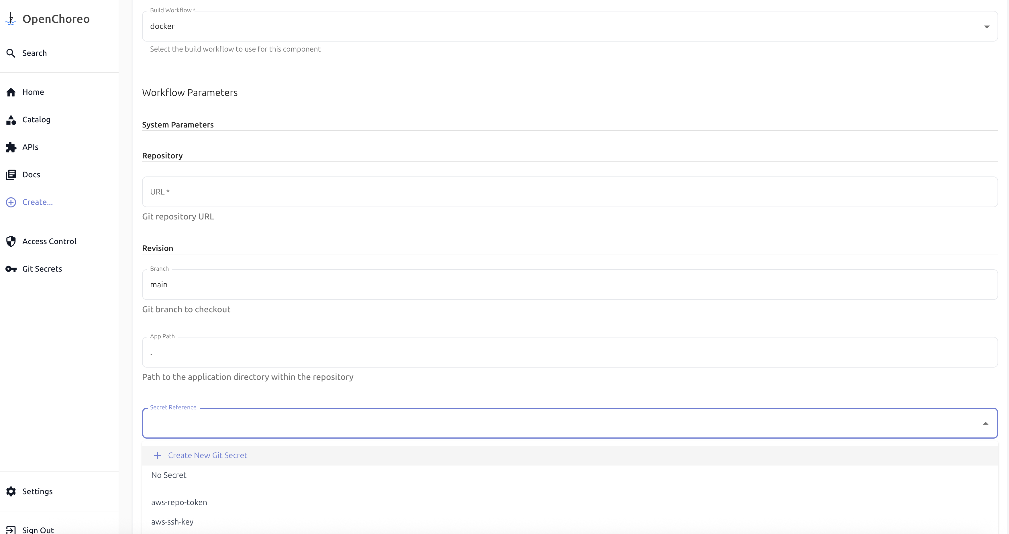 The easiest way to configure private repository access is through the OpenChoreo UI. You can create secrets either during component creation or pre-create them for reuse.