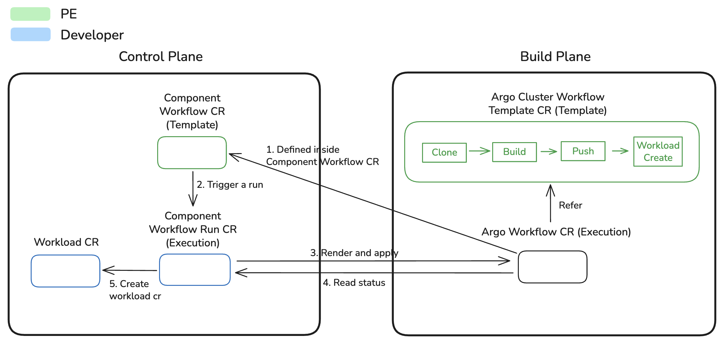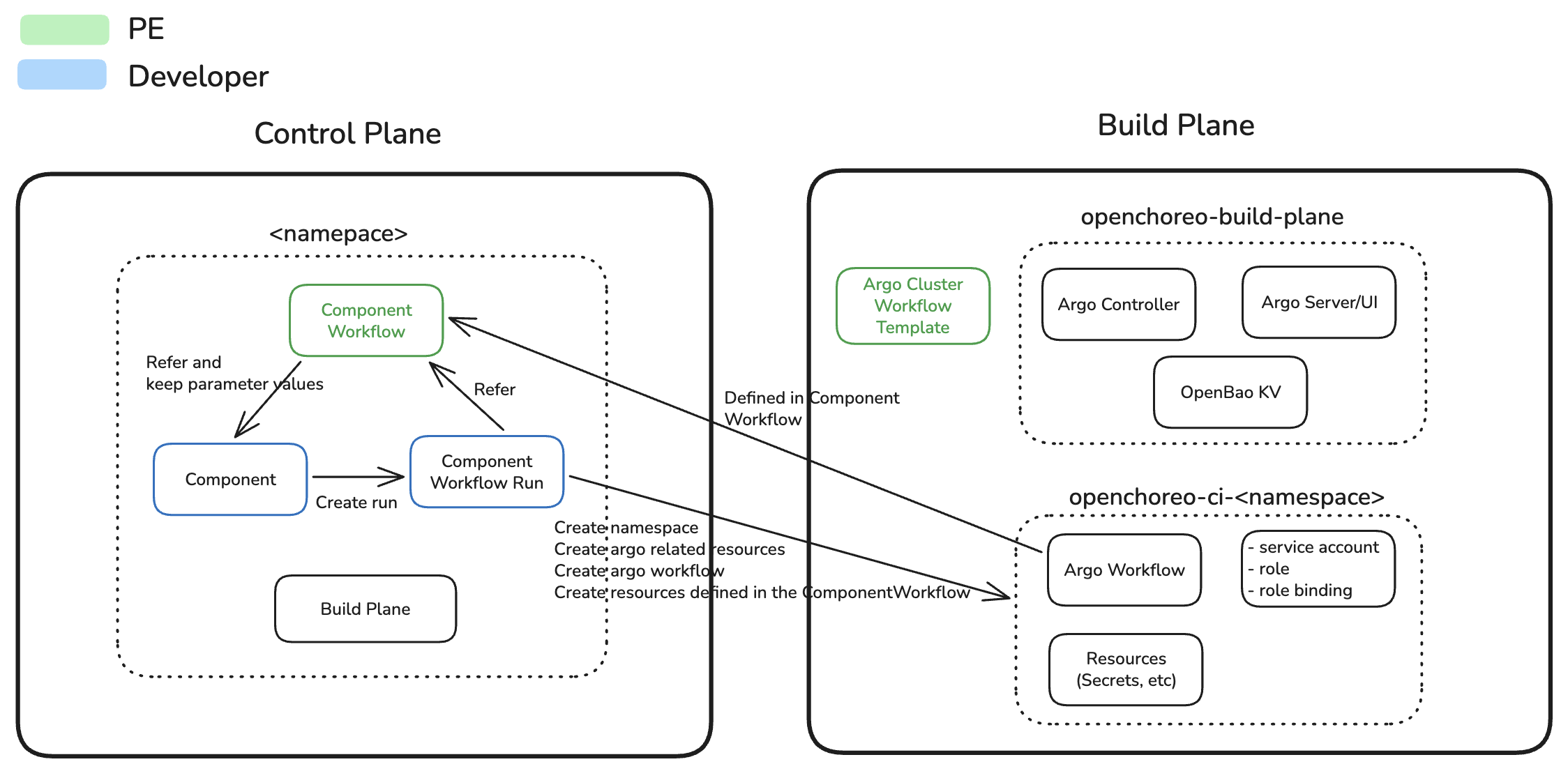 - Control Plane: Hosts ComponentWorkflow and ComponentWorkflowRun CRs, orchestrates workflow execution