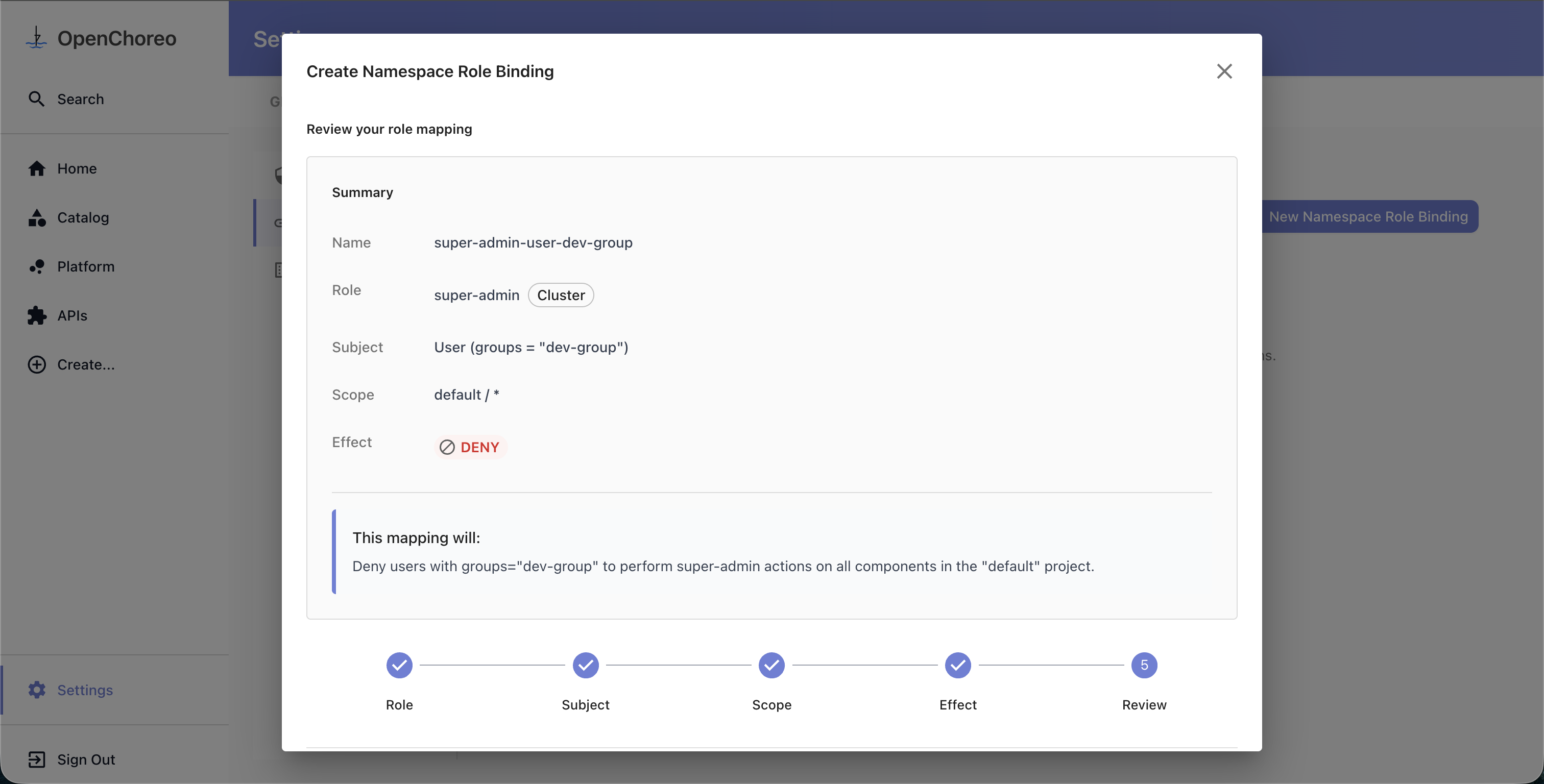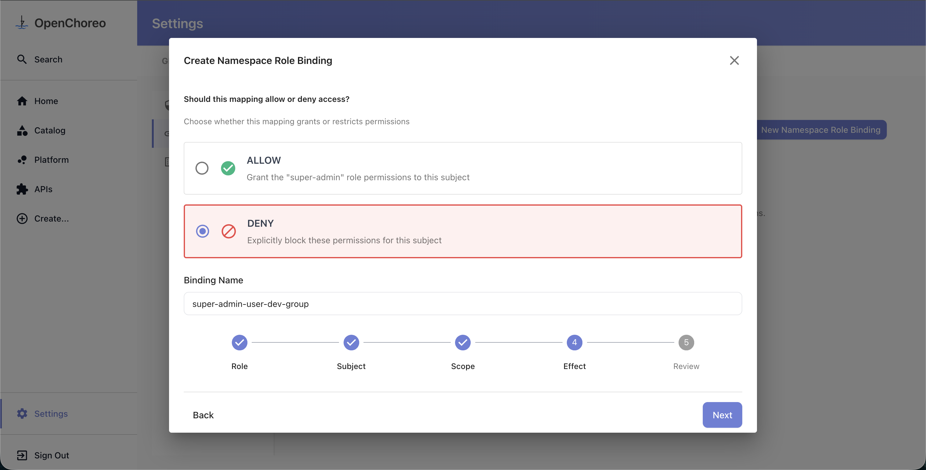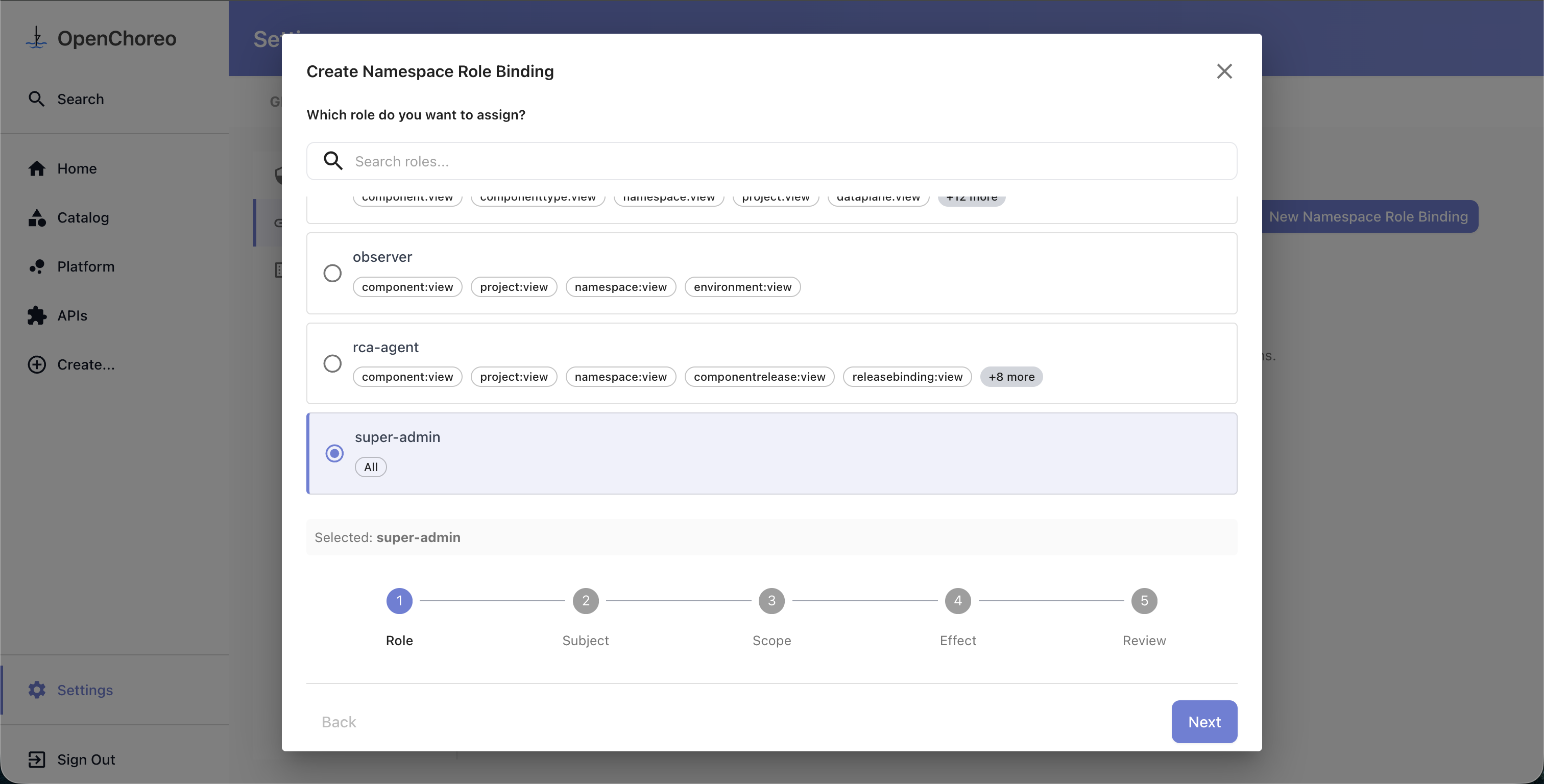 This guide walks through creating custom roles and role bindings to control access in your OpenChoreo installation using the Access Control UI in Backstage.