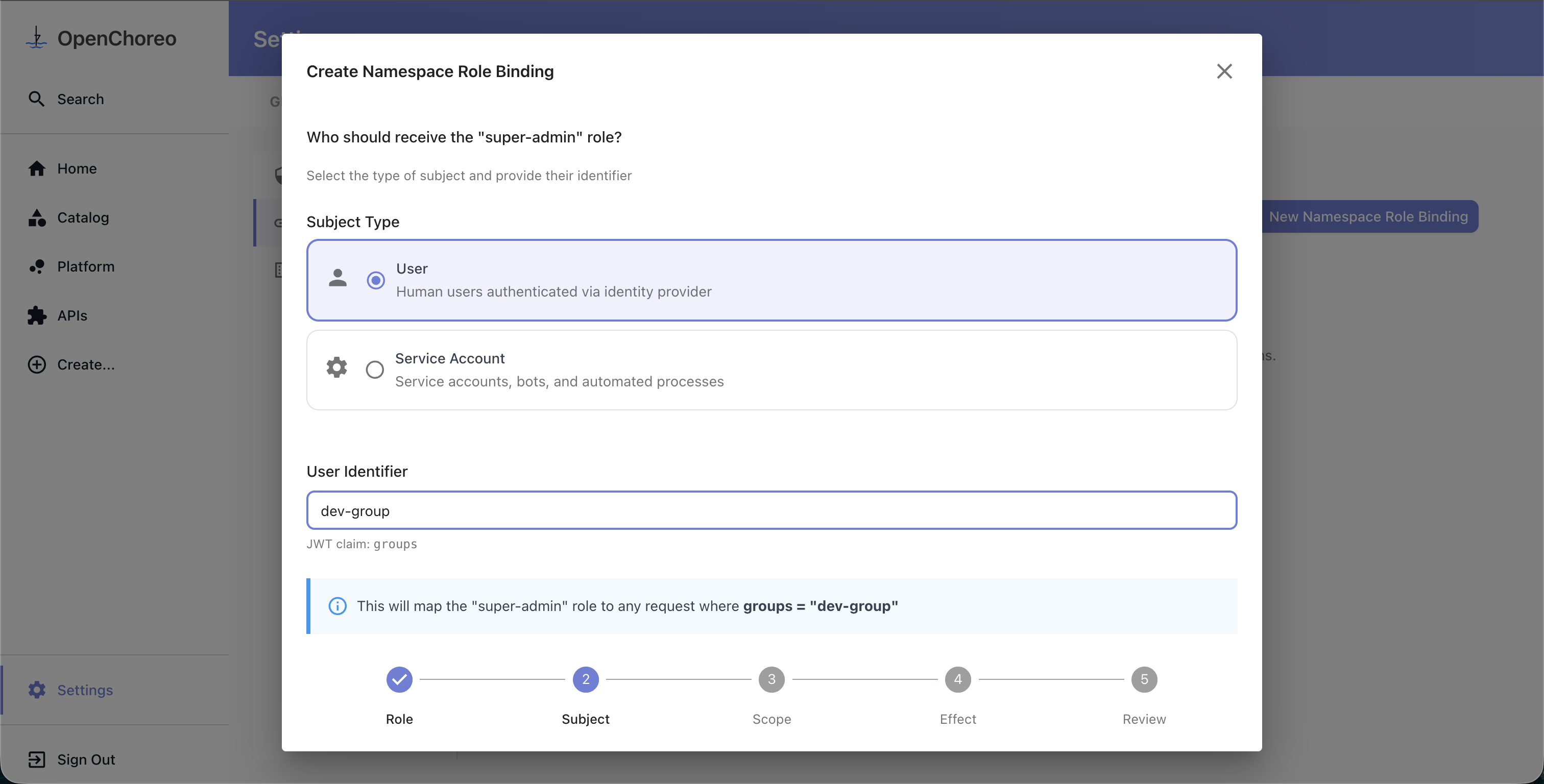 Choose the subject type and provide an identifier. The available subject types and their JWT claim mappings are configured via the security.userTypes section in the Helm values. For example, if your installation defines a "User" type mapped to the groups claim, you would enter a group name like platform-team as the identifier.