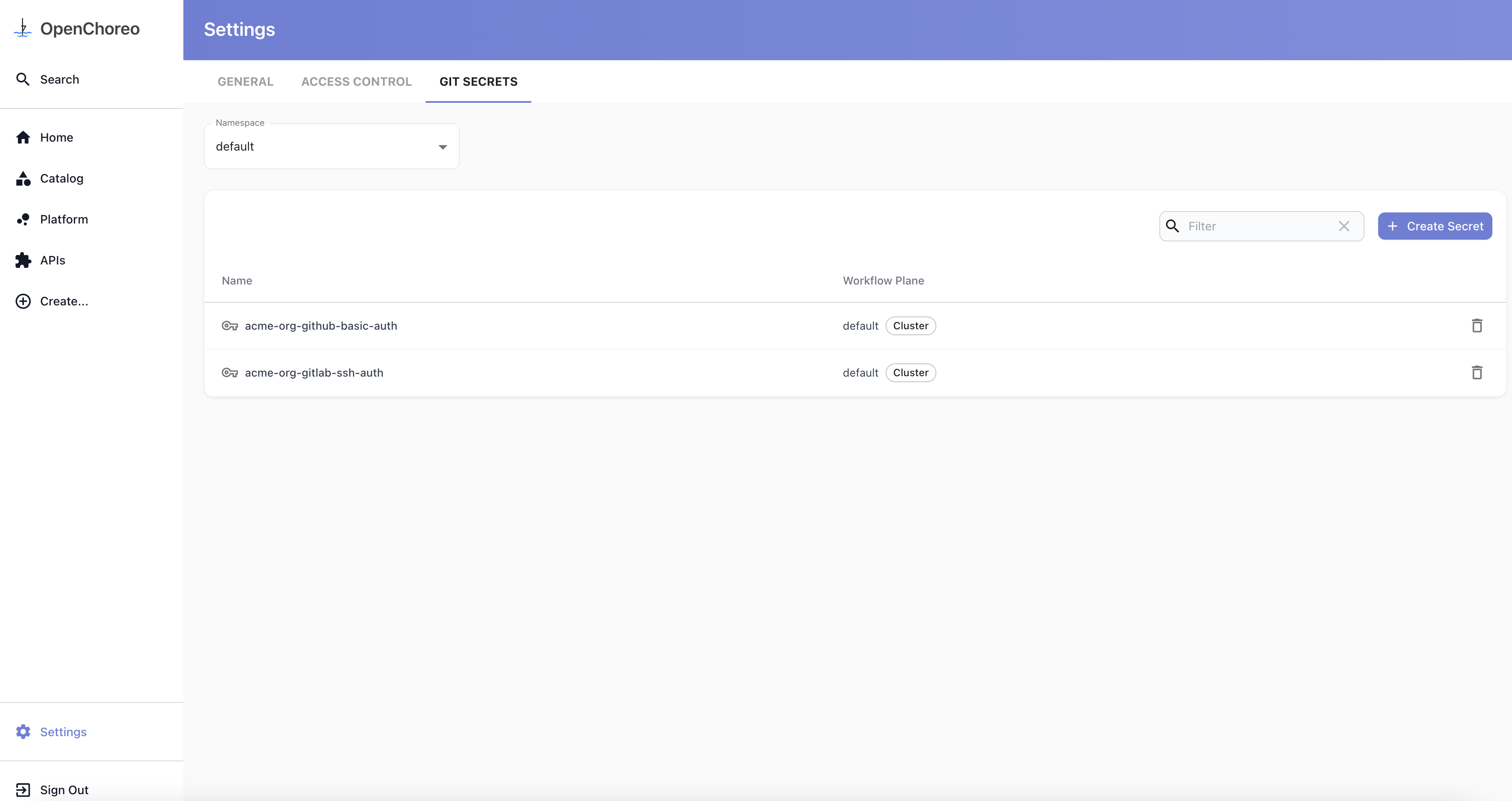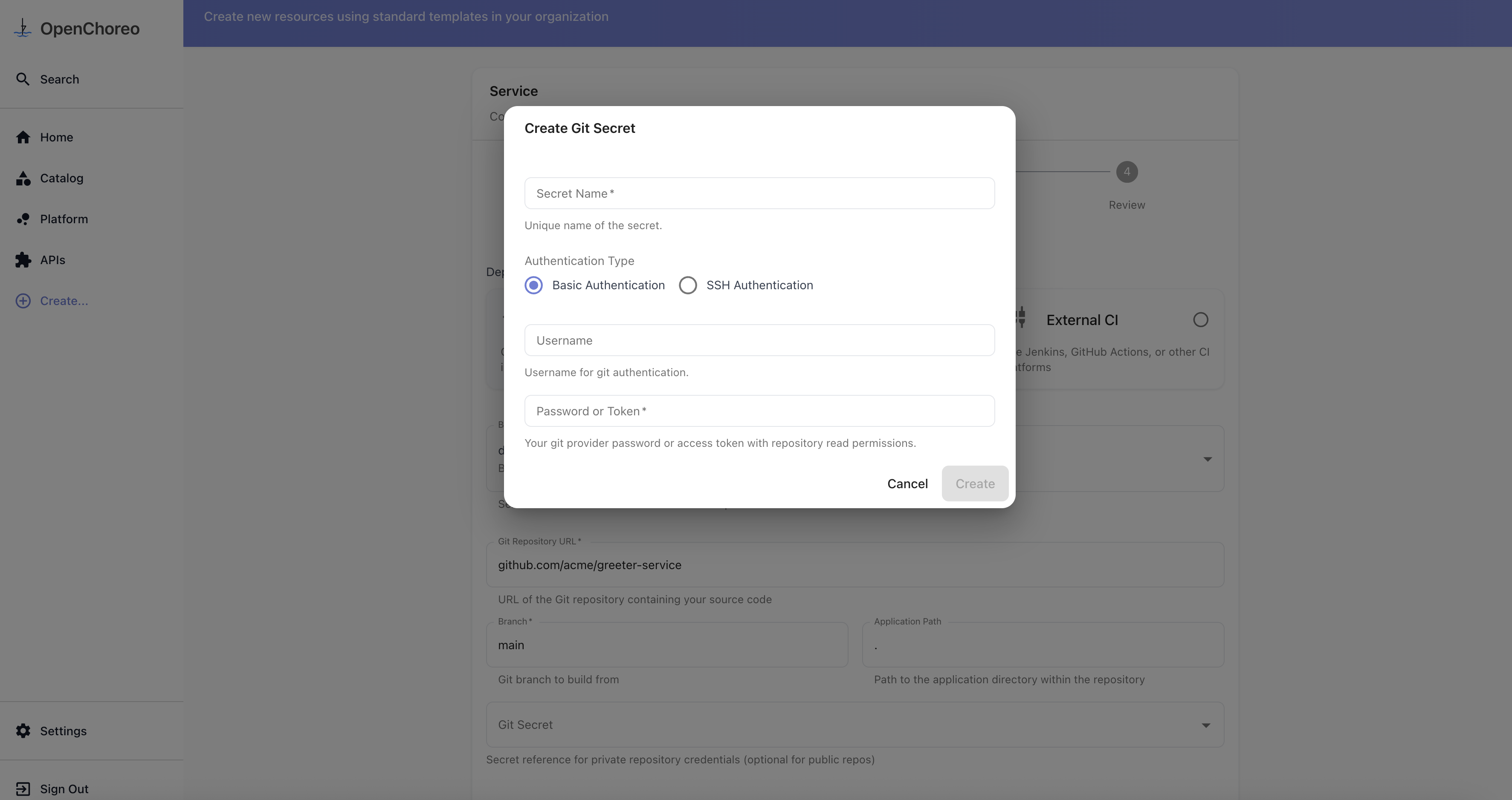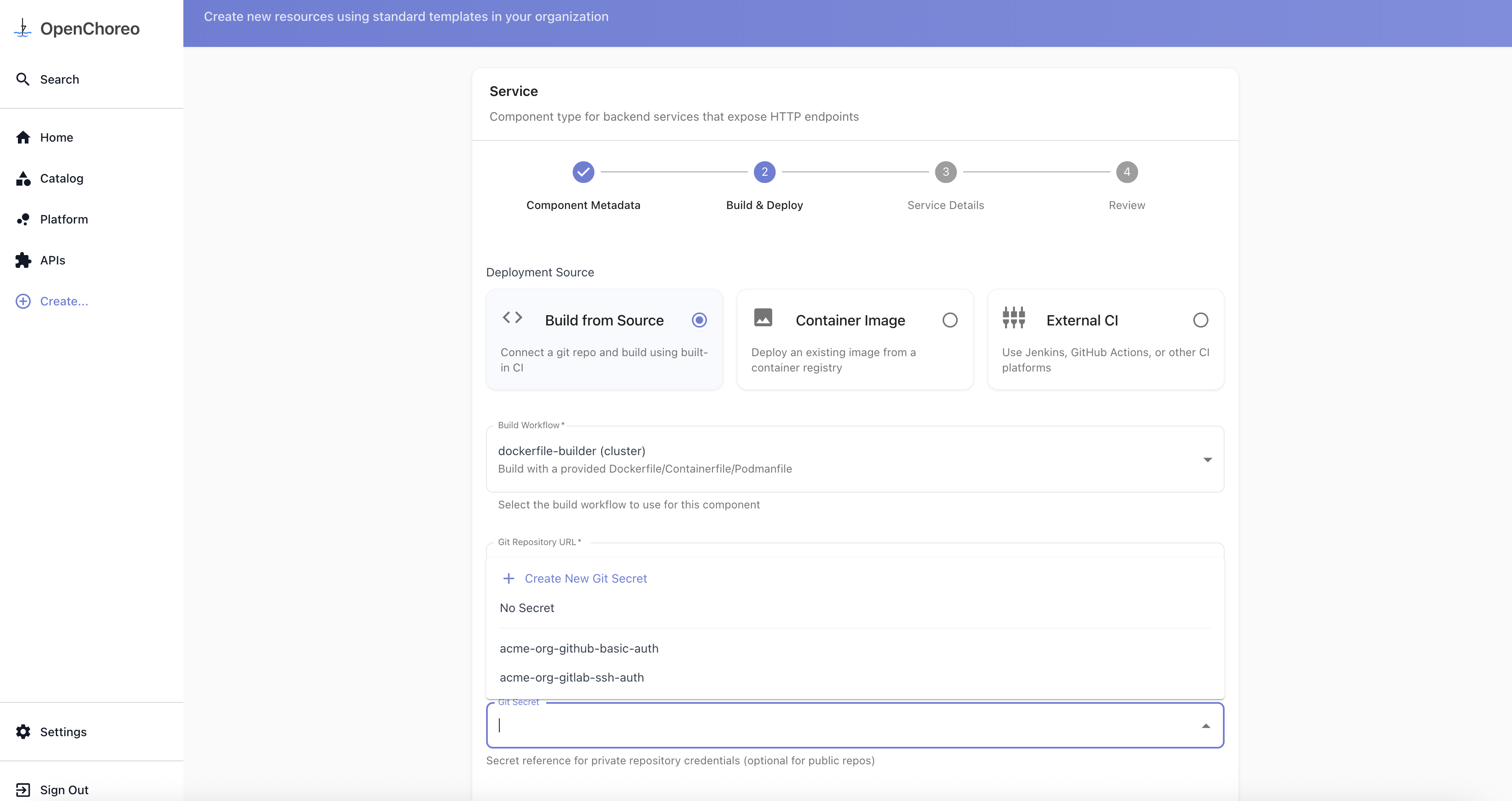 The easiest way to configure private repository access is through the OpenChoreo UI. You can create secrets either during component creation or pre-create them for reuse.